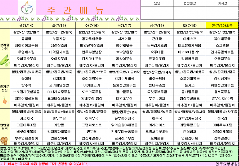 25년 7월 3주차 식단 페이지 정보 작성자 영양팀장 댓글 0건 조회 111회 작성일 25-07-13 10:20 목록 본문 25년 7월 3주차 식단 이전글25년 7월 4주차 식단 25.07.20 다음글25년7월2주차식단 25.07.04