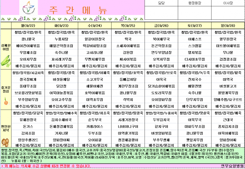 25년 9월 4주차 식단 페이지 정보 작성자 영양팀장 댓글 0건 조회 90회 작성일 25-09-19 11:14 목록 본문 25년 9월 4주차 식단 이전글25년 9월 5주차 식단 25.09.26 다음글25년 9월 3주차식단 25.09.12