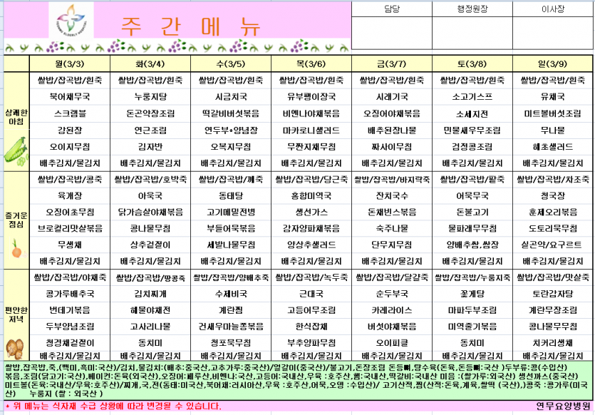 3월1주차 식단표 페이지 정보 작성자 영양팀장 댓글 0건 조회 118회 작성일 25-02-27 10:36 목록 본문 3월1주차 식단표 이전글3월2주차식단표 25.03.07 다음글2월4주차식단 25.02.24
