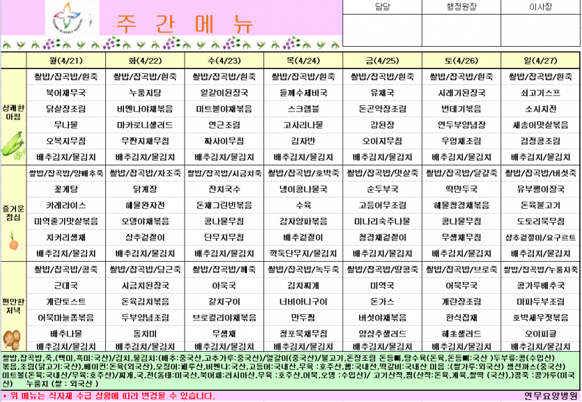 4월4주차식단 페이지 정보 작성자 영양팀장 댓글 0건 조회 111회 작성일 25-04-25 12:45 목록 본문 4월4주차식단 이전글4월5주차식단 25.04.25 다음글4월3주차식단 25.04.11