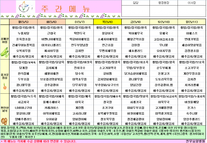 5월1주차식단 페이지 정보 작성자 영양팀장 댓글 0건 조회 121회 작성일 25-05-03 10:20 목록 본문 5월1주차식단 이전글25년5월2주차식단 25.05.09 다음글4월5주차식단 25.04.25