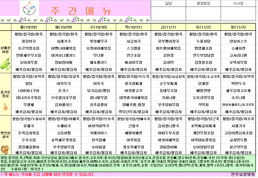 10월5주차 식단 페이지 정보 작성자 영양팀장 댓글 0건 조회 135회 작성일 24-10-24 15:15 목록 본문 10월5주차 식단 이전글11월1주차식단 24.10.30 다음글10월 4주차식단 24.10.18