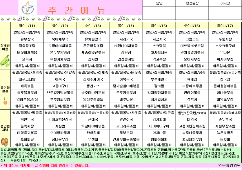 11월2주차식단 페이지 정보 작성자 영양팀장 댓글 0건 조회 133회 작성일 24-11-09 10:16 목록 본문 11월2주차식단 이전글11월3주차식단 24.11.15 다음글11월1주차식단 24.10.30
