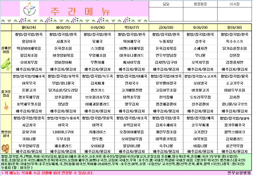 6월4주차식단 페이지 정보 작성자 영양팀장 댓글 0건 조회 127회 작성일 24-06-21 09:27 목록 본문 6월4주차식단 이전글7월1주차식단 24.06.28 다음글6월3주차식단표 24.06.20