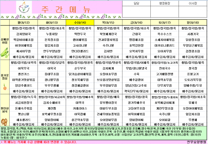 8월2주차식단 페이지 정보 작성자 영양팀장 댓글 0건 조회 131회 작성일 24-08-08 10:29 목록 본문 8월2주차식단 이전글8월3주차식단 24.08.16 다음글8월1주차식단 24.08.05
