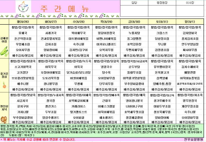 8월4주차식단 페이지 정보 작성자 영양팀장 댓글 0건 조회 119회 작성일 24-08-23 10:37 목록 본문 8월4주차식단 이전글9월1주차식단 24.08.30 다음글8월3주차식단 24.08.16