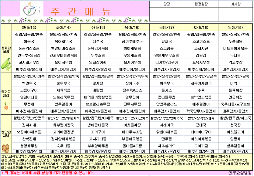 5월 3주 식단표 페이지 정보 작성자 연무요양병원 댓글 0건 조회 149회 작성일 24-05-13 14:04 목록 본문 5월 3주 식단표 이전글6월 2주 식단표 24.06.07 다음글5월 2주차 식단표 24.05.02