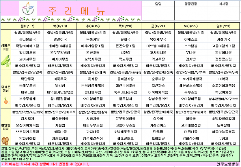 6월3주차식단표 페이지 정보 작성자 영양팀장 댓글 0건 조회 131회 작성일 24-06-20 10:34 목록 본문 6월3주차식단표 이전글6월4주차식단 24.06.21 다음글6월 2주 식단표 24.06.07