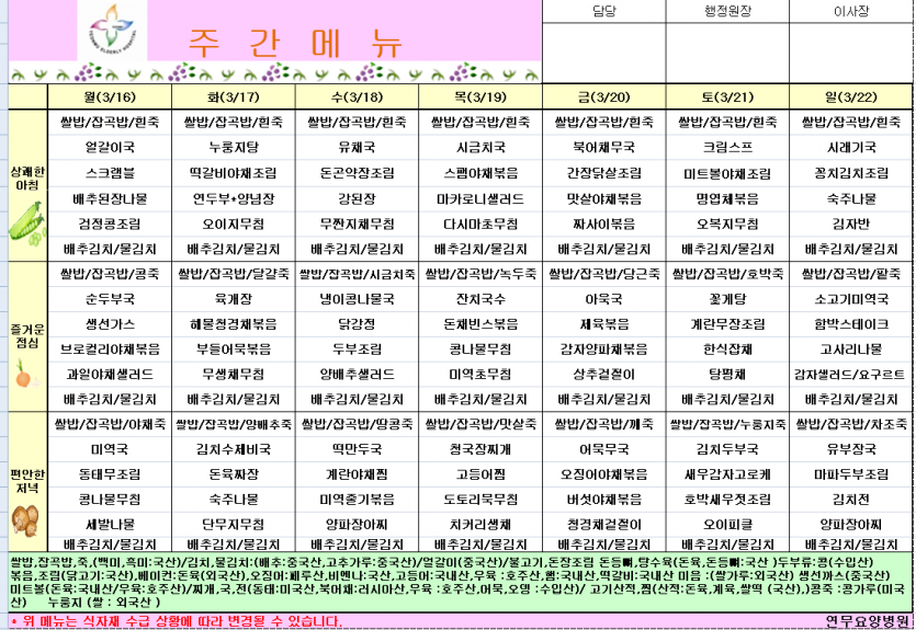 26년 3월 3주차식단 페이지 정보 작성자 영양팀장 댓글 0건 조회 8회 작성일 26-03-13 11:35 목록 본문 26년 3월 3주차식단 이전글26년 3월 4주차식단 26.03.20 다음글26년 3월 2주차식단 26.03.06