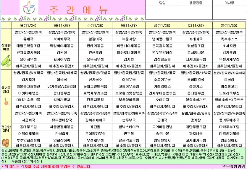 25년 11월 4주차식단 페이지 정보 작성자 영양팀장 댓글 0건 조회 35회 작성일 25-11-20 15:36 목록 본문 25년 11월 4주차식단 이전글25년 12월 1주차식단 25.11.28 다음글25년 11월 3주차 식단 25.11.13