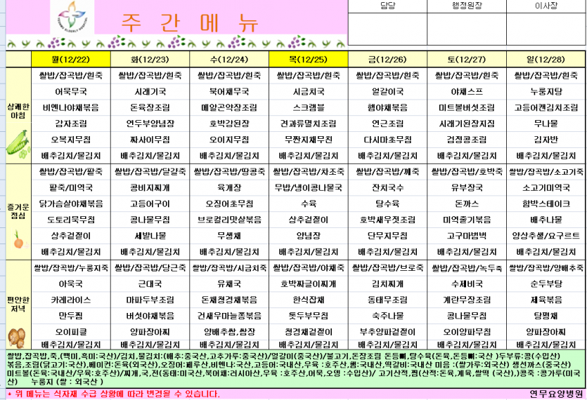 25년 12월 4주차식단 페이지 정보 작성자 영양팀장 댓글 0건 조회 24회 작성일 25-12-19 09:20 목록 본문 25년 12월 4주차식단 이전글25년 12월 5주차식단 25.12.26 다음글25년 12월 3주차식단 25.12.12