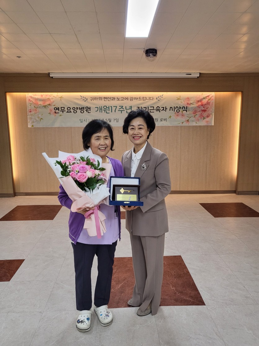 연무요양병원(이사장 송도영)은 개원 17주년을 맞아 10년간 장기근속자에 대한 포상을 실시하고 순금 열쇠를 부상으로 지급하였습니다.