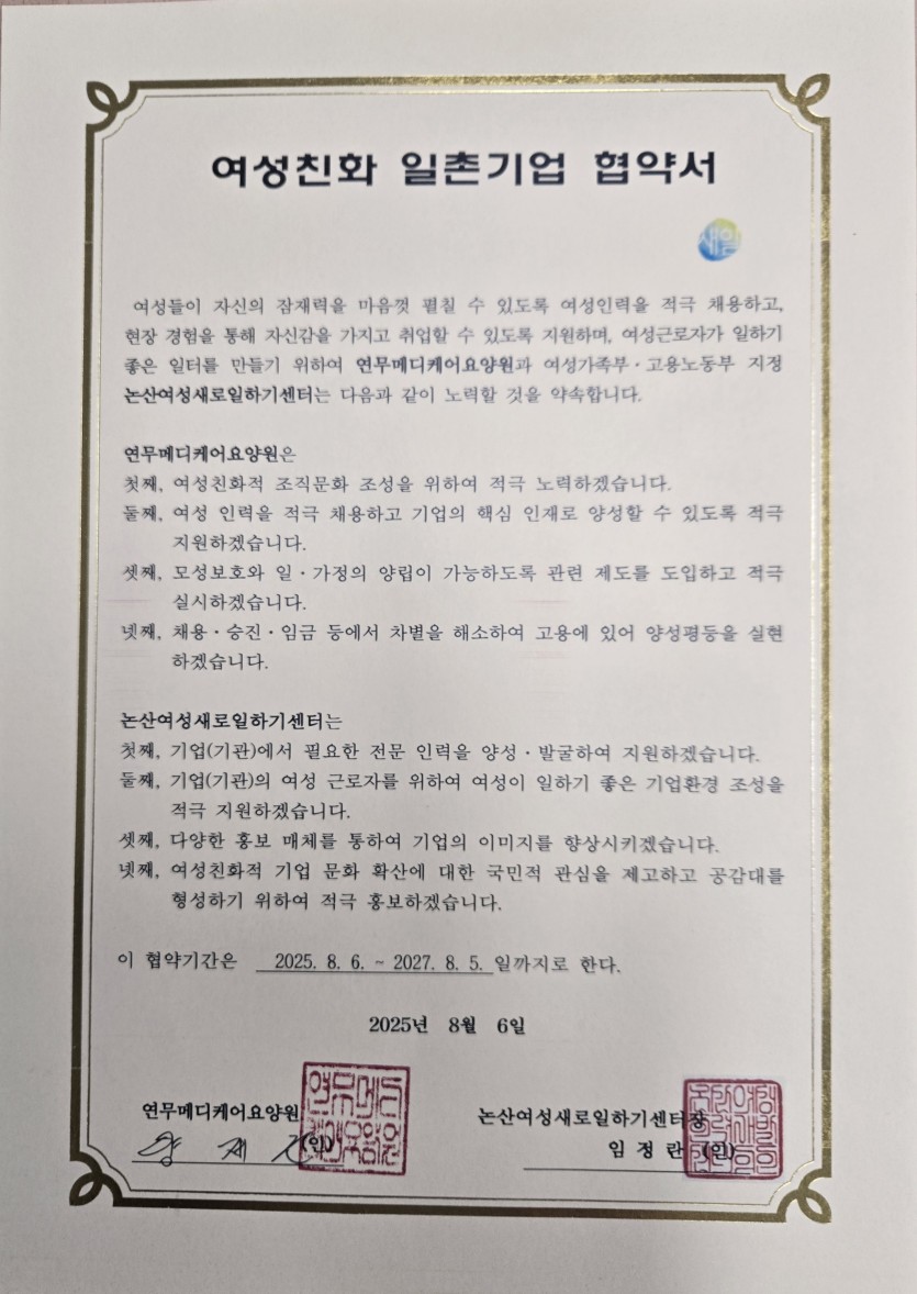 논산 여성새로일하기센터와 본 요양원과 일촌기업협약을 하고