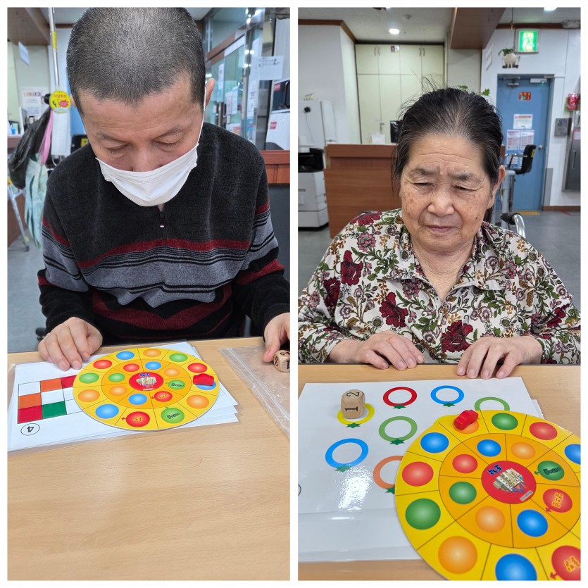 윷놀이와 비슷하다며 큰 숫자 나와라~하면서 주사위를 던지셨고 먼저 도착지에 도착하기를 바라며 흥미로워하시는 모습이 보였습니다.