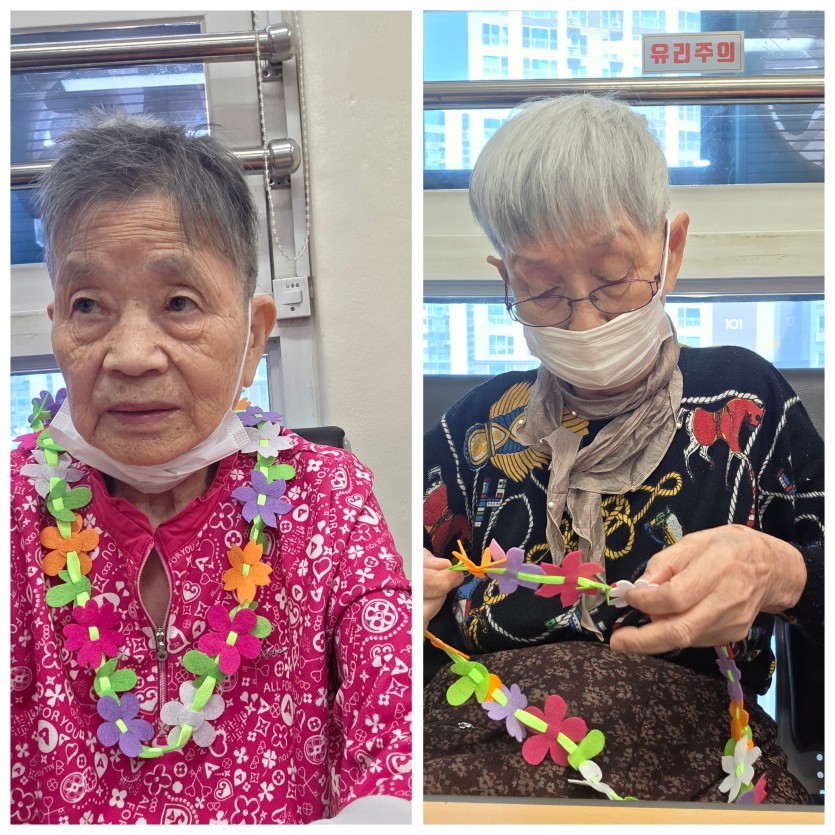 여러가지 색의 꽃을 줄에 패턴대로 끼워 보았는데요 상당한 집중력을 요하는 작업이었지만 , 힘들면 쉬었다를 반복하시면서 모든 어르신들이 작품을 완성해 주셨고,