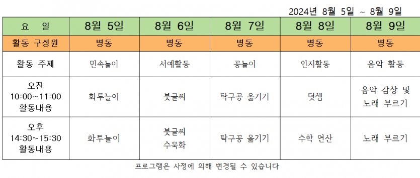 2024.08 2주차 주간 프로그램 페이지 정보 작성자 사회복지사 댓글 0건 조회 150회 작성일 24-08-05 10:01 목록 본문 2024.08.05 이전글2024.08.12 ( 3주차 주간 프로그램 ) 24.08.13 다음글2024.07.29 ( 주간 프로그램 ) 24.07.30