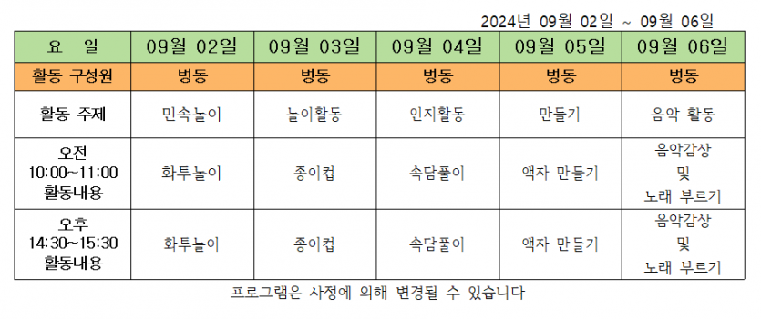 2024.09.02 ( 9월 첫째 주 ) 페이지 정보 작성자 사회복지사 댓글 0건 조회 128회 작성일 24-09-04 12:47 목록 본문 2024.09.02 이전글2024.09.07 ( 9월 2주 차 프로그램 ) 24.09.07 다음글2024.08.26 ( 8월 5주차 주간 프로그램 ) 24.08.27