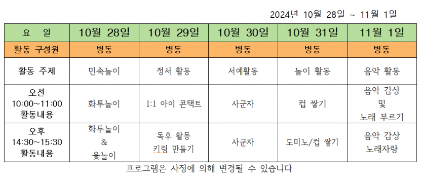 2024.10.27 ( 5주 차 주간 프로그램 ) 페이지 정보 작성자 사회복지사 댓글 0건 조회 130회 작성일 24-10-27 09:42 목록 본문 2024.10.27 이전글2024.11.04 ( 11월 1주 차 주간 프로그램 ) 24.11.04 다음글2024.10.21 ( 4주 차 주간프로그램 ) 24.10.20