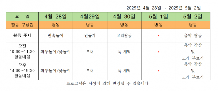 2025.04.28 ( 4월 5주 차 주간 프로그램 ) 페이지 정보 작성자 사회복지사 댓글 0건 조회 114회 작성일 25-04-28 16:58 목록 본문 2025.04.28 이전글2025.05.07 ( 5월 첫째 주 주간 프로그램 ) 25.05.07 다음글2025.04.19 ( 4주 차 주간 프로그램 ) 25.04.19