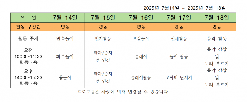2025.07.13 ( 7월 3주 차 주간 프로그램 ) 페이지 정보 작성자 사회복지사 댓글 0건 조회 102회 작성일 25-07-14 12:28 목록 본문 2025.07.13 이전글2025.07.21 ( 7월 4주 차 주간 프로그램 ) 25.07.21 다음글2025.07.07 ( 7월 2주 차 주간 프로그램 ) 25.07.07