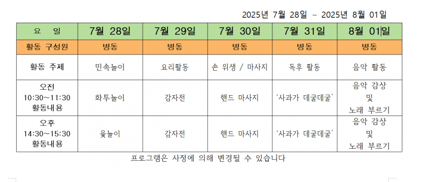 2025.07.28 ( 7월 5주 차 주간프로그램 ) 페이지 정보 작성자 사회복지사 댓글 0건 조회 107회 작성일 25-07-28 12:58 목록 본문 2025.07.28 이전글2025.08.04 ( 8월 1주차 주간 프로그램 ) 25.08.04 다음글2025.07.21 ( 7월 4주 차 주간 프로그램 ) 25.07.21