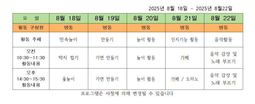 2025.08.18 ( 8월 3주 차 주간프로그램 ) 페이지 정보 작성자 사회복지사 댓글 0건 조회 96회 작성일 25-08-19 09:08 목록 본문 2025.08.18 이전글2025.08.024 ( 8월 4주 차 주간프로그램 ) 25.08.24 다음글2025.08.11 ( 8월 2주 차 주간 프로 그램 ) 25.08.11