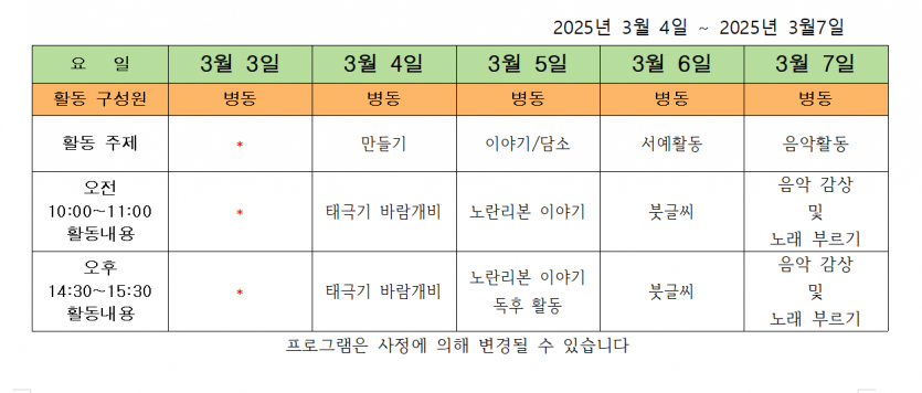 2025.03.04 ( 1주 차 주간 프로그램 ) 페이지 정보 작성자 사회복지사 댓글 0건 조회 117회 작성일 25-03-04 17:58 목록 본문 2025.03.04 이전글25.03.10 ( 3월 2주 차 주간 프로그램 ) 25.03.10 다음글2025.02.23 ( 2월 4주 차 주간 프로그램 ) 25.02.23