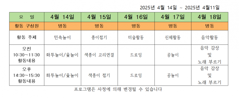 2025.04. 14 ( 4월 3 주 차 주간 프로그램 ) 페이지 정보 작성자 사회복지사 댓글 0건 조회 117회 작성일 25-04-14 17:37 목록 본문 2025.04.14 이전글2025.04.19 ( 4주 차 주간 프로그램 ) 25.04.19 다음글2025.04월 2주 차 주간 프로그램 25.04.04