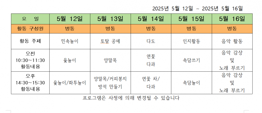 2025.05.11 ( 5월 3주차 주간 프로그램 ) 페이지 정보 작성자 사회복지사 댓글 0건 조회 128회 작성일 25-05-11 15:31 목록 본문 2025.05.11 이전글2025.05.19 ( 5월 4주 차 주간 프로그램 ) 25.05.20 다음글2025.05.07 ( 5월 첫째 주 주간 프로그램 ) 25.05.07