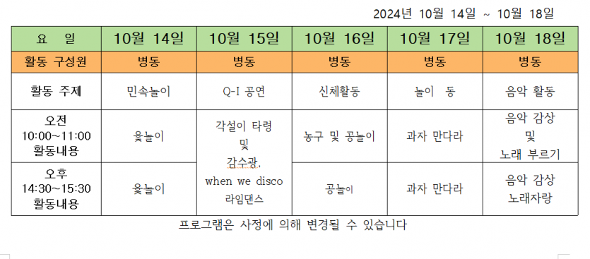 2024.10.14 ( 3주 차 주간 프로그램 ) 페이지 정보 작성자 사회복지사 댓글 0건 조회 136회 작성일 24-10-16 13:05 목록 본문 2024.10.14 이전글2024.10.21 ( 4주 차 주간프로그램 ) 24.10.20 다음글2024.10.07 ( 2 주차 주간 프로그램 ) 24.10.07