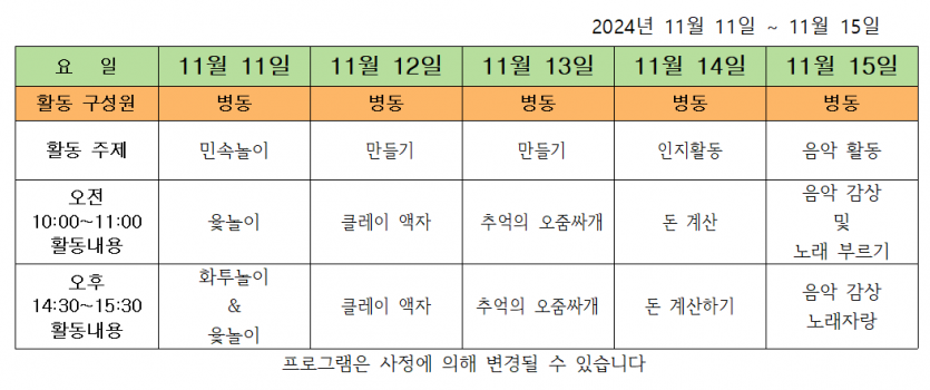 2024.11.11( 2주 차 주간 프로그램 ) 페이지 정보 작성자 사회복지사 댓글 0건 조회 125회 작성일 24-11-10 10:41 목록 본문 2024.11.10 이전글2024.11.24 ( 4주차 즈간 프로그램 ) 24.11.24 다음글2024.11.04 ( 11월 1주 차 주간 프로그램 ) 24.11.04