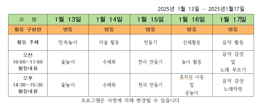 2025.01.13 ( 1월 3주 차 주간 프로그램 ) 페이지 정보 작성자 사회복지사 댓글 0건 조회 122회 작성일 25-01-14 17:00 목록 본문 2025.01.13 이전글2025.01.21 ( 1월 4주 차 프로그램) 25.01.21 다음글2025.01.06 ( 1월 첫째 주 주간 프로그램) 25.01.07