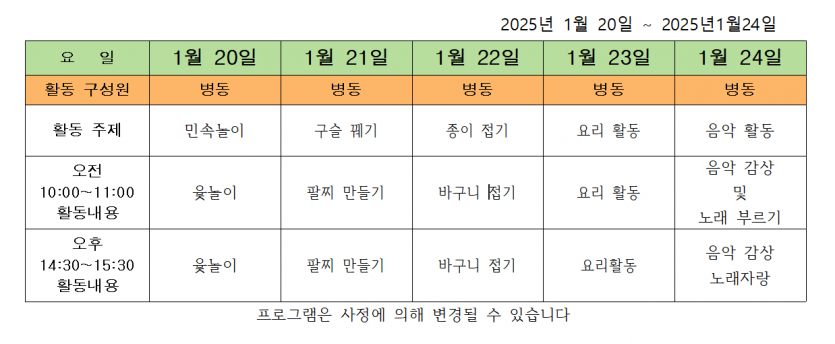 2025.01.21 ( 1월 4주 차 프로그램) 페이지 정보 작성자 사회복지사 댓글 0건 조회 121회 작성일 25-01-21 09:00 목록 본문 2025.01.20 이전글2025.02.03 ( 2월 1주 차 주간 프로그램 ) 25.02.04 다음글2025.01.13 ( 1월 3주 차 주간 프로그램 ) 25.01.14