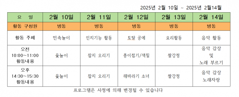 2025.02.10 ( 2월 2주 차 주간 프로그램 ) 페이지 정보 작성자 사회복지사 댓글 0건 조회 119회 작성일 25-02-11 13:56 목록 본문 2025.02.10 이전글2025.02. 3주 차 주간 프로그램 25.02.17 다음글2025.02.03 ( 2월 1주 차 주간 프로그램 ) 25.02.04
