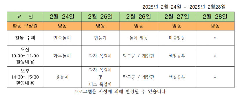 2025.02.23 ( 2월 4주 차 주간 프로그램 ) 페이지 정보 작성자 사회복지사 댓글 0건 조회 122회 작성일 25-02-23 12:15 목록 본문 2025.02.23 이전글2025.03.04 ( 1주 차 주간 프로그램 ) 25.03.04 다음글2025.02. 3주 차 주간 프로그램 25.02.17