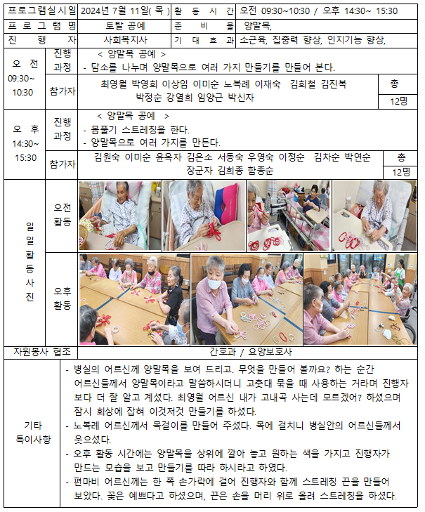 2024.07.11(토탈공예) 페이지 정보 작성자 사회복지사 댓글 0건 조회 154회 작성일 24-07-11 17:30 목록 본문 2024.07.11 이전글2024.07.12(음악활동) 24.07.14 다음글2024.07월 2주차 주간활동 24.07.11