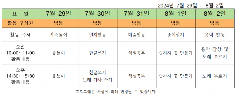 2024.07.29 ( 주간 프로그램 ) 페이지 정보 작성자 사회복지사 댓글 0건 조회 142회 작성일 24-07-30 11:43 목록 본문 2024.07.29 이전글2024.08 2주차 주간 프로그램 24.08.05 다음글2024.07.19 ( 4주 차 주간 계획서) 24.07.19