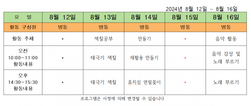 2024.08.12 ( 3주차 주간 프로그램 ) 페이지 정보 작성자 사회복지사 댓글 0건 조회 135회 작성일 24-08-13 17:18 목록 본문 2024.08.12 이전글2024.08.19 ( 4주 차 주간 프로그램 ) 24.08.19 다음글2024.08 2주차 주간 프로그램 24.08.05