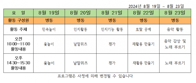 2024.08.19 ( 4주 차 주간 프로그램 ) 페이지 정보 작성자 사회복지사 댓글 0건 조회 135회 작성일 24-08-19 14:20 목록 본문 2024.08.19 이전글2024.08.26 ( 8월 5주차 주간 프로그램 ) 24.08.27 다음글2024.08.12 ( 3주차 주간 프로그램 ) 24.08.13