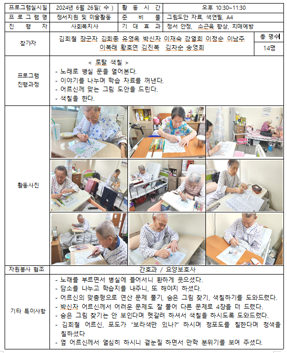 24.06.26 색칠 공부 페이지 정보 작성자 사회복지사 댓글 0건 조회 151회 작성일 24-06-26 17:37 목록 본문 2024.06.26 이전글20.06.28 신체활동 24.06.27 다음글정서지원 24.06.25