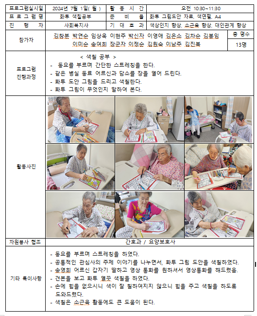색칠활동 페이지 정보 작성자 사회복지사 댓글 0건 조회 151회 작성일 24-07-01 11:59 목록 본문 2024.07.01 이전글2024.0705(음악활동) 24.07.05 다음글2024.06.28( 음악 활동 ) 24.06.28