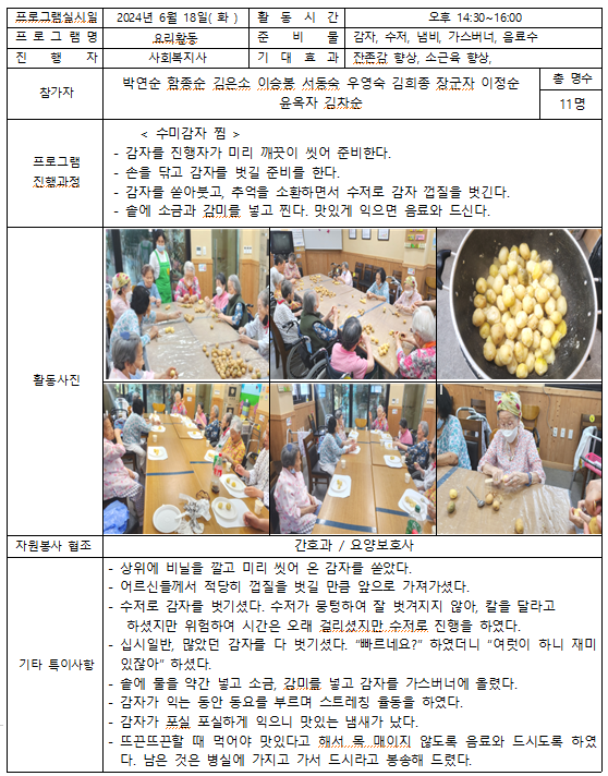 6.18 프로그램(요리활동) 페이지 정보 작성자 사회복지사 댓글 0건 조회 165회 작성일 24-06-19 12:09 목록 본문 6.18 프로그램(요리활동) 이전글2024.06.19프로그램 24.06.20 다음글6.17 프로그램(윷놀이) 24.06.18