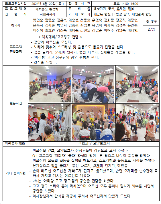 2024.06.20 페이지 정보 작성자 사회복지사 댓글 0건 조회 164회 작성일 24-06-20 17:57 목록 본문 2024.06.20 이전글24.06.21 24.06.21 다음글2024.06.19프로그램 24.06.20