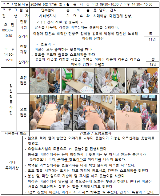 6.17 프로그램(윷놀이) 페이지 정보 작성자 관리자 댓글 0건 조회 186회 작성일 24-06-18 11:41 목록 본문 6.17 프로그램(윷놀이) 이전글6.18 프로그램(요리활동) 24.06.19 다음글24.05.03 프로그램 24.05.03