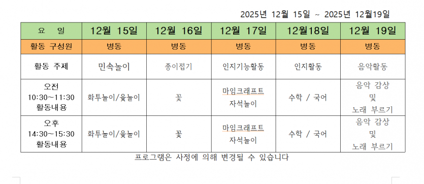 2025.12.15 ( 12월 3주 차 주간 프로그램 ) 페이지 정보 작성자 사회복지사 댓글 0건 조회 24회 작성일 25-12-16 09:58 목록 본문 2025.12.15 이전글2025.12.22 ( 12월 4째 주 주간 프로그램 ) 25.12.23 다음글2025.12. ( 2주 차 주간프로그램 ) 25.12.07