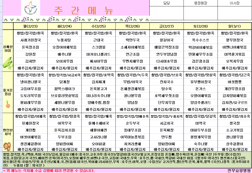 26년 2월 4주차식단 페이지 정보 작성자 영양팀장 댓글 0건 조회 50회 작성일 26-02-23 11:32 목록 본문 26년 2월 4주차식단 이전글26년 3월 1주차식단 26.02.27 다음글26년 2월 3주차식단 26.02.14