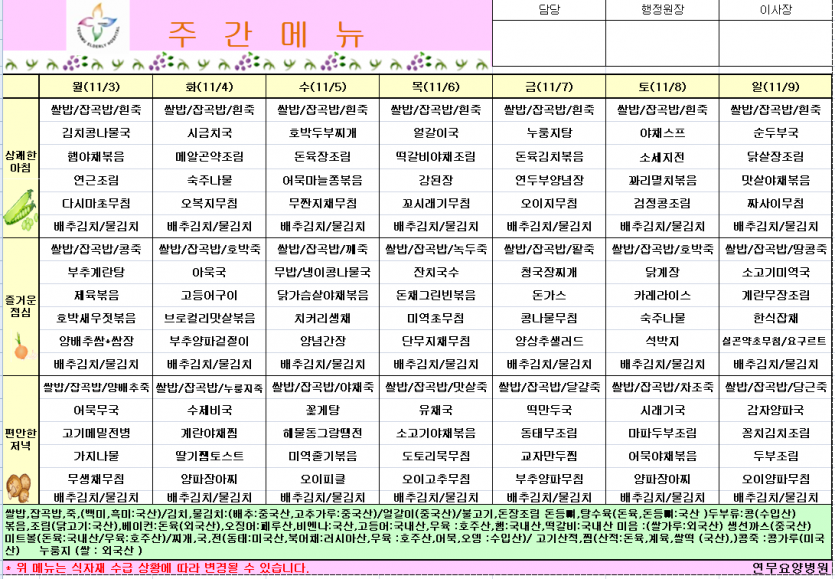 25년 11월 1주차 식단 페이지 정보 작성자 영양팀장 댓글 0건 조회 94회 작성일 25-10-31 09:47 목록 본문 25년 11월 1주차 식단 이전글25년 11월 2주차식단 25.11.08 다음글25년 10월 4주차식단 25.10.24