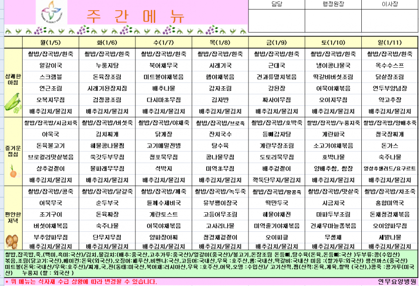 26년 1월 1주차식단 페이지 정보 작성자 영양팀장 댓글 0건 조회 71회 작성일 26-01-02 15:31 목록 본문 26년 1월 1주차식단 이전글26년 1월 2주차식단 26.01.09 다음글25년 12월 5주차식단 25.12.26