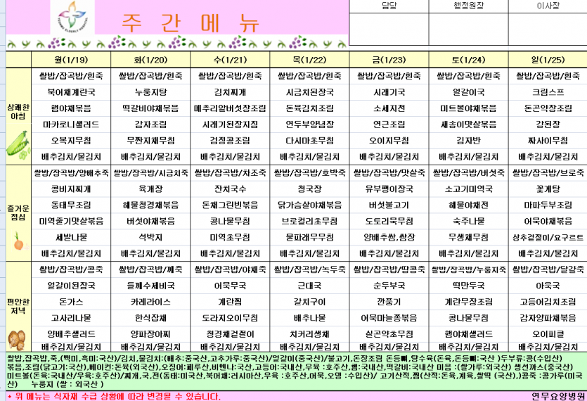 26년 1월 3주차식단 페이지 정보 작성자 영양팀장 댓글 0건 조회 60회 작성일 26-01-16 09:27 목록 본문 26년 1월 3주차식단 이전글26년1월4주차식단 26.01.23 다음글26년 1월 2주차식단 26.01.09