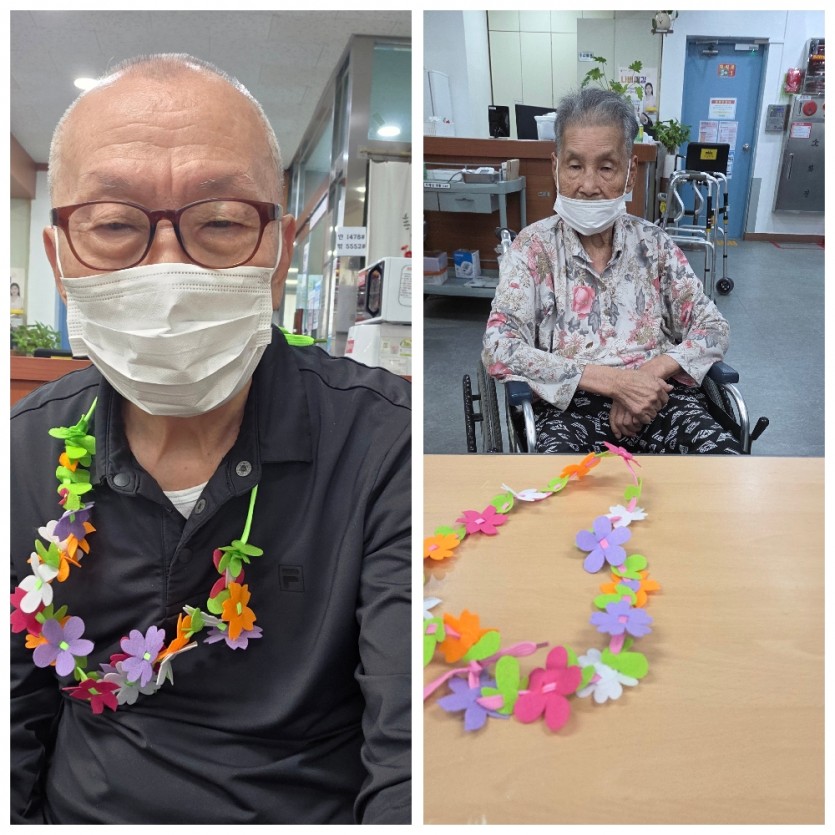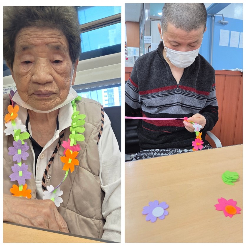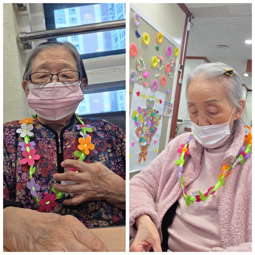 여러가지 색의 꽃을 줄에 패턴대로 끼워 보았는데요 상당한 집중력을 요하는 작업이었지만 , 힘들면 쉬었다를 반복하시면서 모든 어르신들이 작품을 완성해 주셨고,